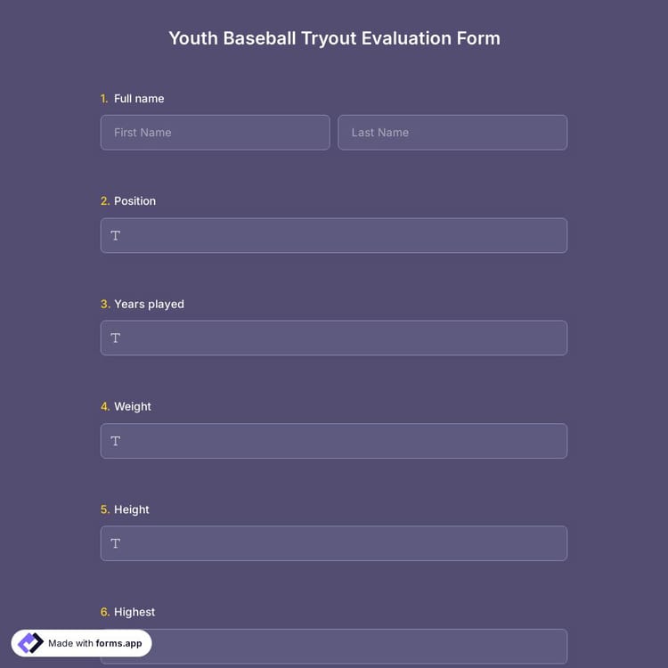 Using forms to evaluate players' skills and abilities during baseball team tryouts provides a good way of building a team. Use forms.app's professional tryout evaluation form template to create your form for free and make a fair selection!