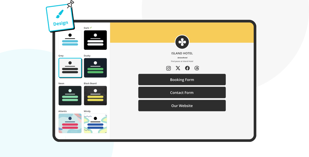 You can change the look of your profile from the “Design” tab. You can add a profile photo (it might be your hotel's logo), choose a ready-to-use Unsplash, or add yours. You can also change the profile's theme or customize the text, background color, font type, etc.