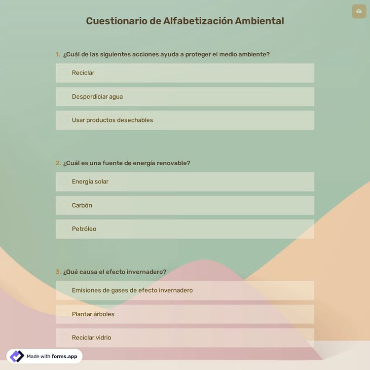 El test de alfabetización ambiental ayuda a medir el conocimiento de las personas sobre sostenibilidad, problemas ambientales, agotamiento de recursos y muchos otros problemas importantes. Con un cuestionario en línea, puede ver qué soluciones encuentran las personas para los problemas ambientales y determinar su comprensión sobre el medio ambiente.
