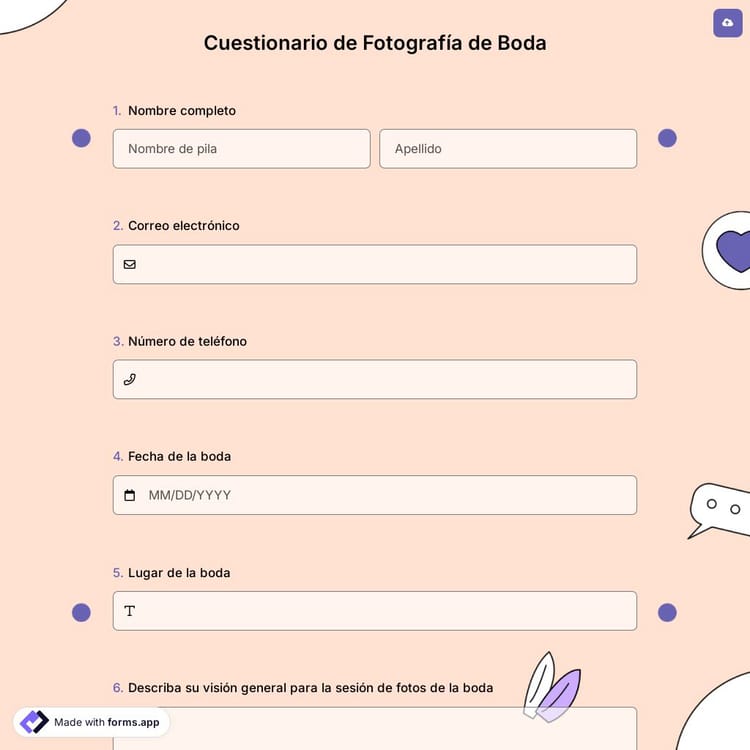 Como fotógrafo de bodas, conocer de antemano las preferencias, deseos o expectativas de los novios hace que tu trabajo sea lo más fácil y eficiente posible. También es importante para satisfacer mejor las expectativas de las parejas. Crea un cuestionario utilizando el modelo gratuito de cuestionario de fotografía de boda. Ofrece a los invitados de la boda una experiencia fotográfica más personalizada y eficiente!