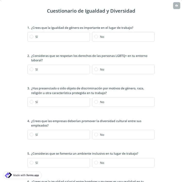 Utilice el cuestionario de igualdad y diversidad para recopilar información de sus empleados, candidatos a empleo u otros sobre sus actitudes y experiencias con respecto a la igualdad y diversidad. Puede desarrollar políticas y prácticas a partir de la encuesta que promuevan la igualdad y diversidad e identifiquen posibles desafíos. ¡Utilice la plantilla gratuita de cuestionario de igualdad y diversidad para crear su cuestionario fácilmente!