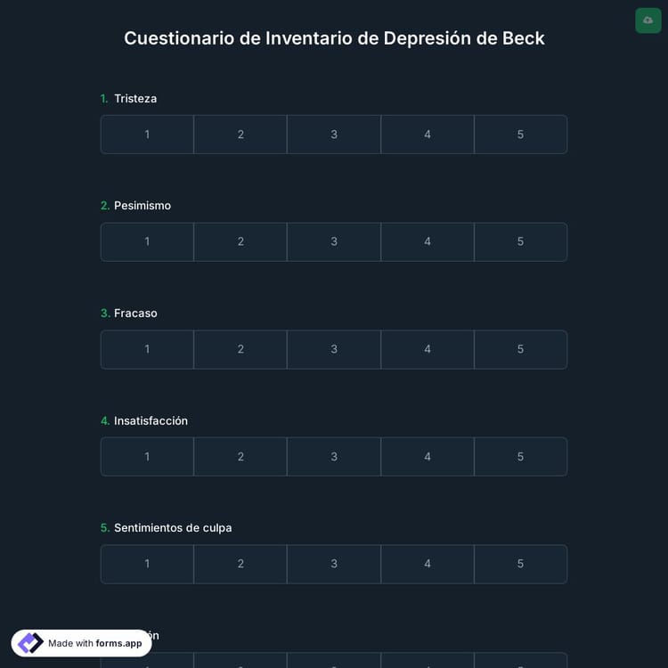 Las preguntas abordan parámetros como tristeza, culpa, pérdida de energía y sueño. Cada respuesta recibe una puntuación y la puntuación total determina la gravedad de la depresión. Puede preferir administrar este inventario a través de un cuestionario porque es rápido, conveniente y fácil. Con los modelos de encuestas gratuitos, los campos de preguntas de opción múltiple y la función de calculadora de forms.app, puedes hacer que el inventario esté listo para ser administrado profesionalmente.