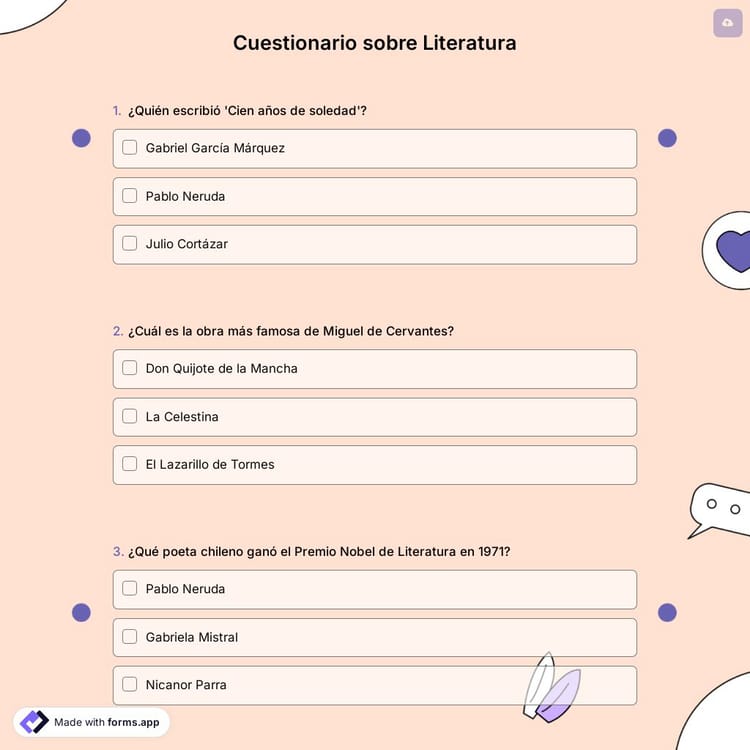 Un modelo de quiz de literatura te ayuda a crear un quiz para tus estudiantes. Incluye preguntas de opción múltiple, correspondencia y respuestas breves. También puedes incluir una pregunta opcional de redacción al final de tu quiz. Como herramienta de creación de quiz, forms.app te permite agregar diferentes tipos de preguntas para diferentes temas literarios.