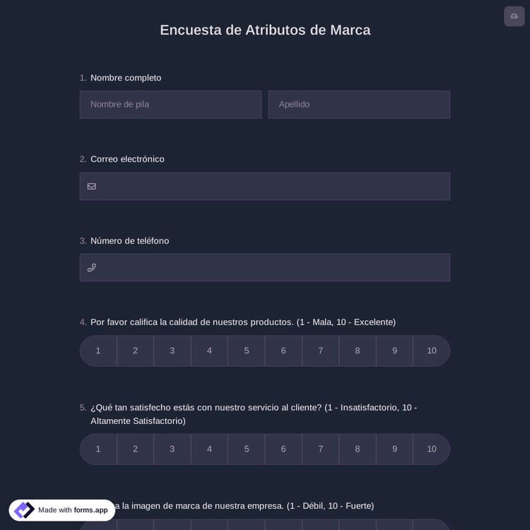 La encuesta de atributos de marca es un documento en línea que ayuda a las marcas a comprender cómo los clientes se involucran y se relacionan con su marca y sus productos. Puede desarrollar productos y determinar estrategias de marketing con las respuestas de esta encuesta de mercado. Puede crear su encuesta de atributos de marca en solo unos segundos en forms.app.