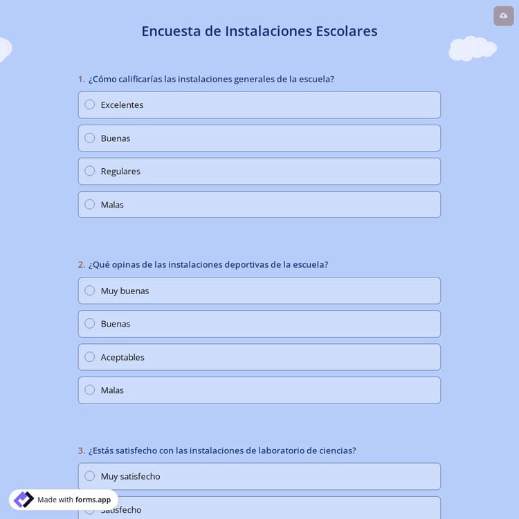 La creación de encuestas sobre instalaciones escolares es una forma efectiva para que las escuelas garanticen entornos seguros y funcionales que promuevan el aprendizaje y el éxito de los estudiantes. Crea tu encuesta utilizando el modelo de encuesta de instalaciones escolares para identificar áreas inadecuadas y peligros en la escuela. ¡Comienza a hacer cambios en el diseño de la escuela con los resultados de la encuesta!
