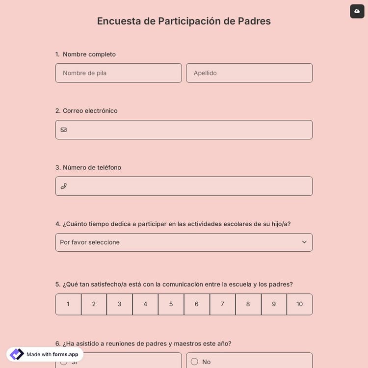 Si eres un investigador o educador que trabaja con cuidado infantil, necesitarás una encuesta sobre la participación de los padres. Al abrir este modelo de encuesta sobre la participación de los padres, puedes crear tu propio cuestionario, obtener comentarios de los padres y analizar los resultados.