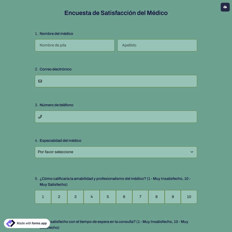 Una serie de preguntas en el formulario aborda temas como el ambiente de trabajo, el trato a los pacientes, el apoyo administrativo y la satisfacción general. La encuesta puede realizarse en papel o en línea, y al analizar las respuestas se pueden identificar tendencias y patrones. Esto facilita la comprensión de los deseos y necesidades del equipo médico por parte de los hospitales. Puedes usar forms.app fácilmente y comenzar ahora mismo.