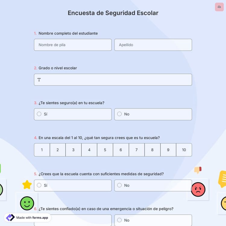 Puede utilizar muchas plantillas de encuestas escolares en forms.app de forma gratuita. Podrás crear tu encuesta de seguridad escolar en no más de un minuto. También es posible realizar tu propio diseño con varias opciones de personalización.