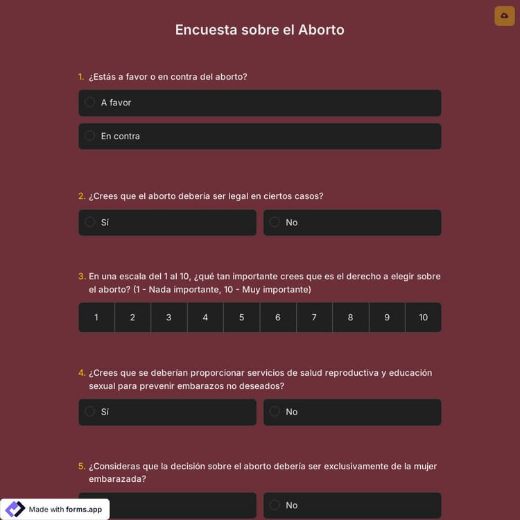 Para comprender y abordar preocupaciones o desafíos relacionados con el aborto, las encuestas sobre aborto son la elección correcta. Cree su encuesta rápidamente utilizando la plantilla gratuita de forms.app y prepárese para ver los resultados.