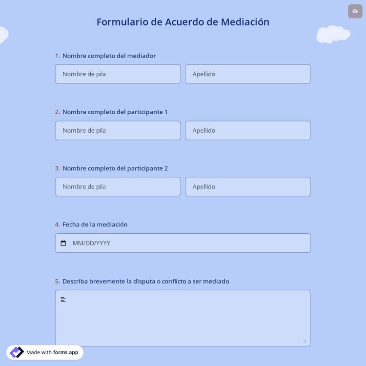 Cuando dos personas parecen no poder llegar a un acuerdo, a veces pueden buscar la ayuda de un mediador. Un formulario de acuerdo de mediación en línea puede ayudar a los mediadores a deshacerse de largos procesos burocráticos y trabajar de manera más eficiente. De hecho, puede utilizar esta plantilla de formulario de acuerdo de mediación gratuita para crear su formulario en minutos.
