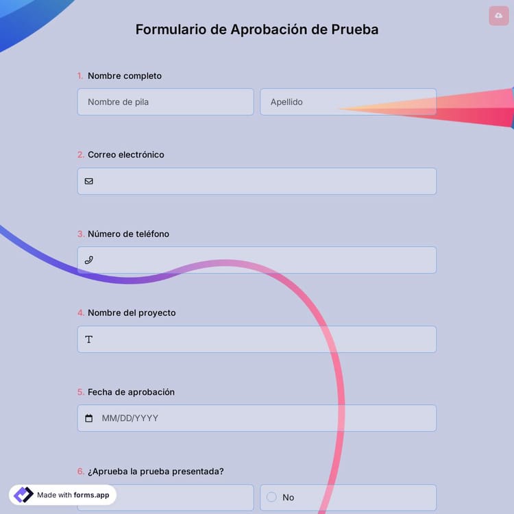 Un formulario de aprobación de prueba se utiliza para proporcionar a sus clientes una prueba del pedido y solicitar su aprobación. Con la ayuda de este formulario de consentimiento, es fácil mostrar al cliente la apariencia real del producto final y evitar cambios de última hora en los proyectos. Puede crear su formulario de aprobación de prueba en cuestión de segundos en forms.app.