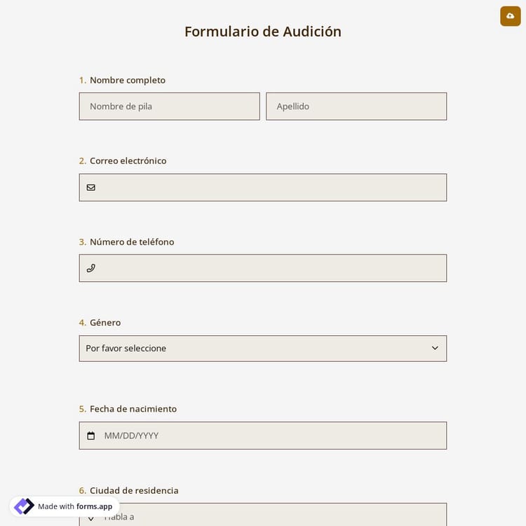 Los formularios de audiciones facilitan el proceso de audición de actores al recopilar la información necesaria del público o de personas específicas. Este formulario en línea le permite previsualizar a los candidatos antes de invitarlos a una audición. Se pueden utilizar por agencias de actores, directores o productores, así como para seleccionar actores de teatro.