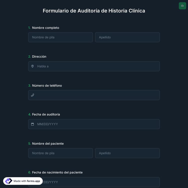 Un formulario de auditoria de registros médicos es un documento que se puede utilizar para examinar y evaluar registros médicos y para auditar la atención médica. Con este formulario de evaluación, puede determinar si los registros médicos cumplen con los requisitos legales e identificar áreas a mejorar. Las organizaciones de atención médica, las compañías de seguros y las agencias reguladoras pueden utilizar este formulario de auditoria en línea. ¡Cree su formulario hoy para una auditoria de registros médicos confiable y completa!