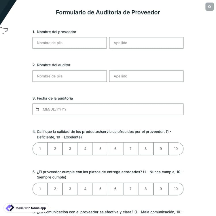 El formulario de auditoría de proveedores es útil durante una auditoría en una empresa para determinar si un proveedor está cumpliendo con los estándares de calidad y servicio establecidos por la empresa. Edite este formulario de inspección gratuito de acuerdo con sus necesidades. Puede crear fácilmente su formulario de auditoría de proveedores en unos pocos clics en forms.app.