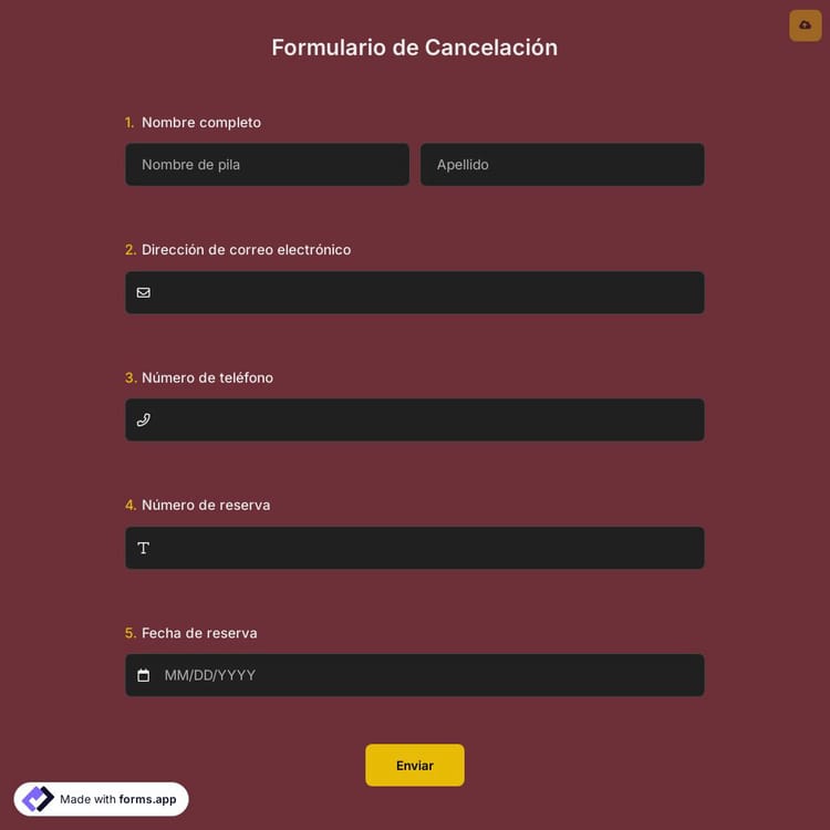 Los formularios de cancelación permiten a los clientes cancelar servicios o productos que le hayan comprado. Un formulario de cancelación en línea básicamente incluye los términos y condiciones de la cancelación, los pasos que debe seguir el cliente para cancelar y solicita la información necesaria, como el nombre del cliente, los datos de contacto o la identificación del cliente. Puede crear fácilmente su formulario en línea utilizando un formulario creador, como forms.app.