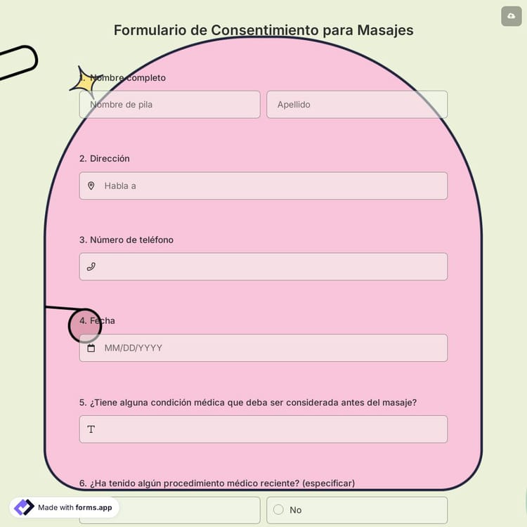Un formulario de consentimiento para masaje es un documento utilizado por masajistas para determinar si los clientes han dado su consentimiento para un masaje. Un masaje puede causar un ligero dolor en algunas partes del cuerpo y un efecto relajante. Por esta razón, necesitas conocer el historial de masajes de los clientes y discutir los efectos sobre ellos. Utilizando este formulario de consentimiento, puedes demostrar que obtuviste el consentimiento de los clientes estés donde estés.