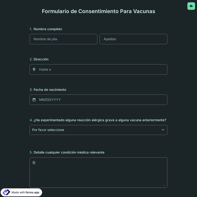 Una institución de salud crea un formulario de consentimiento en línea en un creador de formularios en línea como forms.app. Este formulario advierte al paciente sobre los posibles riesgos antes de administrar cualquier vacuna a un paciente. Luego, la institución de salud compartirá el formulario de consentimiento de la vacuna con su paciente. El paciente lee toda la información y completa todos los campos requeridos del formulario para dar su consentimiento.