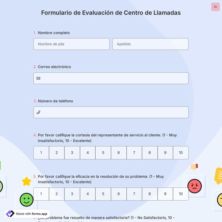 Los formularios de evaluación del centro de llamadas incluyen los comentarios de los clientes sobre el servicio que usted proporciona. Con estas evaluaciones, puede identificar deficiencias y errores en su centro de llamadas. De esta manera, puede proporcionar capacitación y desarrollo de calidad. Utilice los formularios de evaluación del centro de llamadas de forms.app para un servicio de centro de llamadas sin problemas.