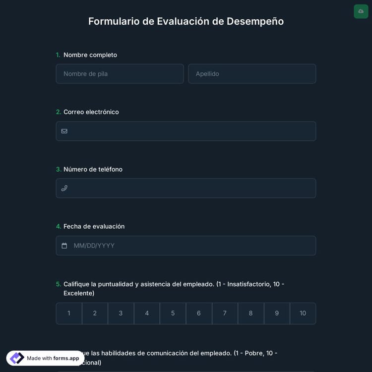 El formulario de evaluación de desempeño te permite recopilar información preliminar sobre el estado actual de tus empleados. De esta manera, puedes identificar las habilidades que cada empleado necesita desarrollar en su departamento y orientarlos. Haz tus evaluaciones más efectivas y eficientes con los modelos de evaluación gratuitos de forms.app. Explora ahora y encuentra el formulario adecuado para cada situación.