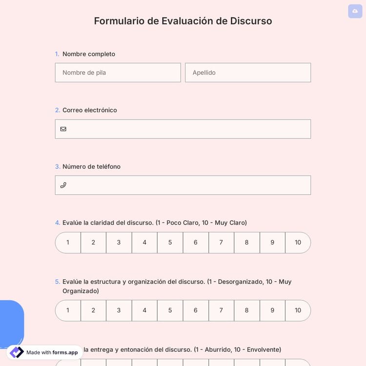 Los formularios de evaluación de discurso ayudan al orador a mejorar sus habilidades de comunicación y entregar discursos o presentaciones más efectivas en el futuro. Pruebe el modelo de formulario de evaluación de discurso gratuito de forms.app para crear su formulario y obtener la opinión de las personas!