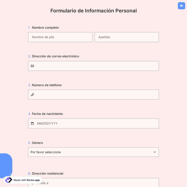 ¿Qué harías si quisieras recopilar información personal de un público? Una respuesta apropiada para esta pregunta es, de hecho, un formulario de informaciones personales. Si no sabes cómo crear uno, puedes encontrar nuestra respuesta utilizando el modelo de formulario de informaciones personales de forms.app ¡ahora mismo!