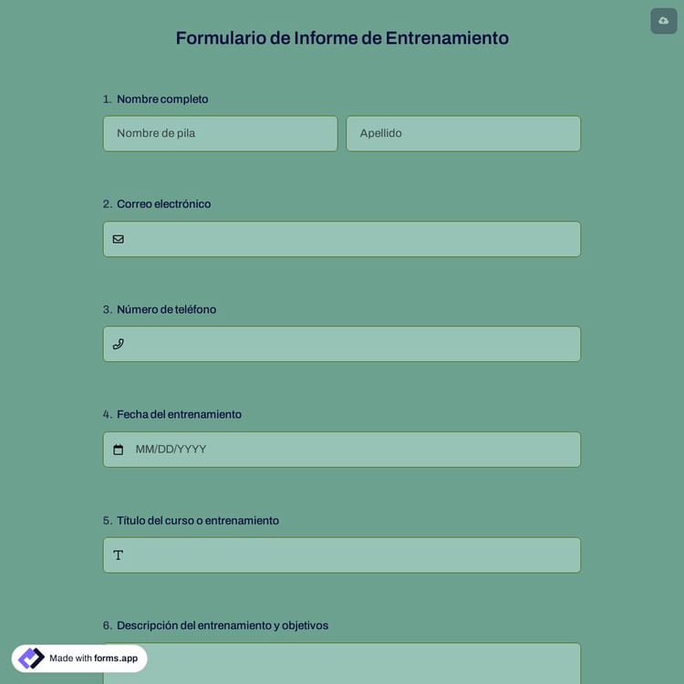 El formulario de informe de entrenamiento es un documento en línea utilizado para recopilar evaluaciones y revisar los aspectos positivos y negativos de un programa de entrenamiento después de su realización. El objetivo del formulario de informe de entrenamiento es determinar los problemas críticos necesarios para que el programa de entrenamiento sea efectivo. Puedes utilizar esta plantilla de formulario de informe de entrenamiento gratuita y crear la tuya propia en forms.app.