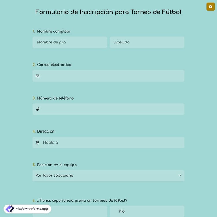 El formulario de inscripción para torneo de fútbol simplifica el proceso para clubes y organizadores de torneos. Este formulario puede ser utilizado por el director del torneo para comparar las estadísticas de todos los competidores y crear una tabla basada en los resultados. ¡Explora la biblioteca de plantillas coloridas y profesionales de forms.app para todos los formularios de inscripción!