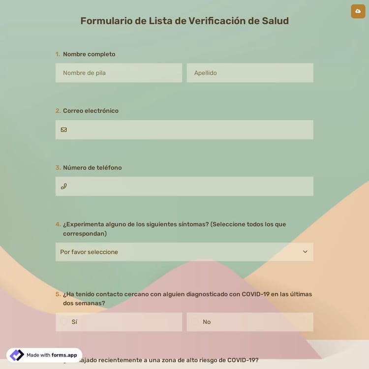Puede asegurarse de que está tomando medidas diarias para mejorar su salud y bienestar general utilizando una lista de verificación de salud. Los formularios médicos pueden ser utilizados tanto para fines profesionales como personales. Los profesionales de la salud generalmente proporcionan una lista de verificación de salud para una evaluación profesional de su estado de salud. Puede crear su formulario de lista de verificación de salud en cuestión de segundos en forms.app.