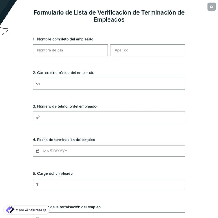 Los formularios de cancelación permiten a los clientes cancelar servicios o productos que le hayan comprado. Un formulario de cancelación en línea básicamente incluye los términos y condiciones de la cancelación, los pasos que debe seguir el cliente para cancelar y solicita la información necesaria, como el nombre del cliente, los datos de contacto o la identificación del cliente. Puede crear fácilmente su formulario en línea utilizando un formulario creador, como forms.app.