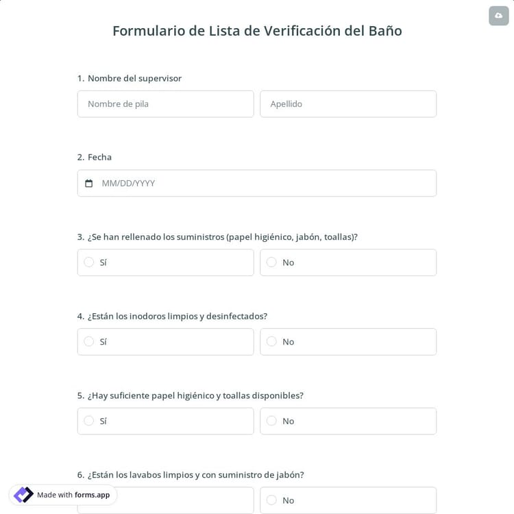 Un formulario de lista de verificación de baños es un formulario de inspección utilizado generalmente por el personal de limpieza o los gerentes del establecimiento para inspeccionar la limpieza y el buen funcionamiento de los baños. Estos formularios de inspección suelen incluir secciones para el estado del piso, la fontanería y los sistemas de ventilación, así como la disponibilidad de productos de limpieza como jabón, toallas de papel y papel higiénico. También puede agregar campos de formulario para cubrir aspectos relacionados con la calificación general de los baños, notas de seguridad e higiene, así como sugerencias para mejorar el servicio.