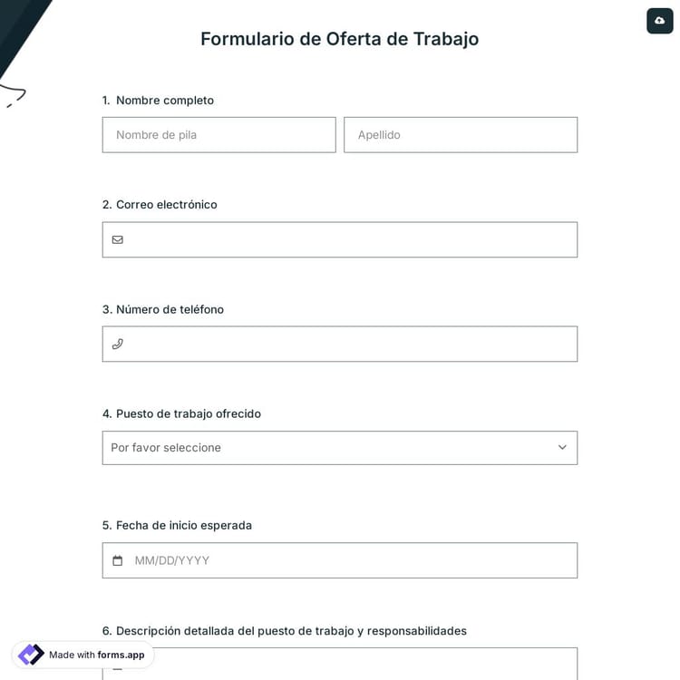 ¿Deseas informar a posibles nuevos empleados sobre la empresa y sus funciones? Las preguntas del modelo de formulario de oferta de empleo son calificadas para proporcionar una visión general de la empresa. Descarga forms.app para crear formularios sin necesidad de conocimientos en codificación!