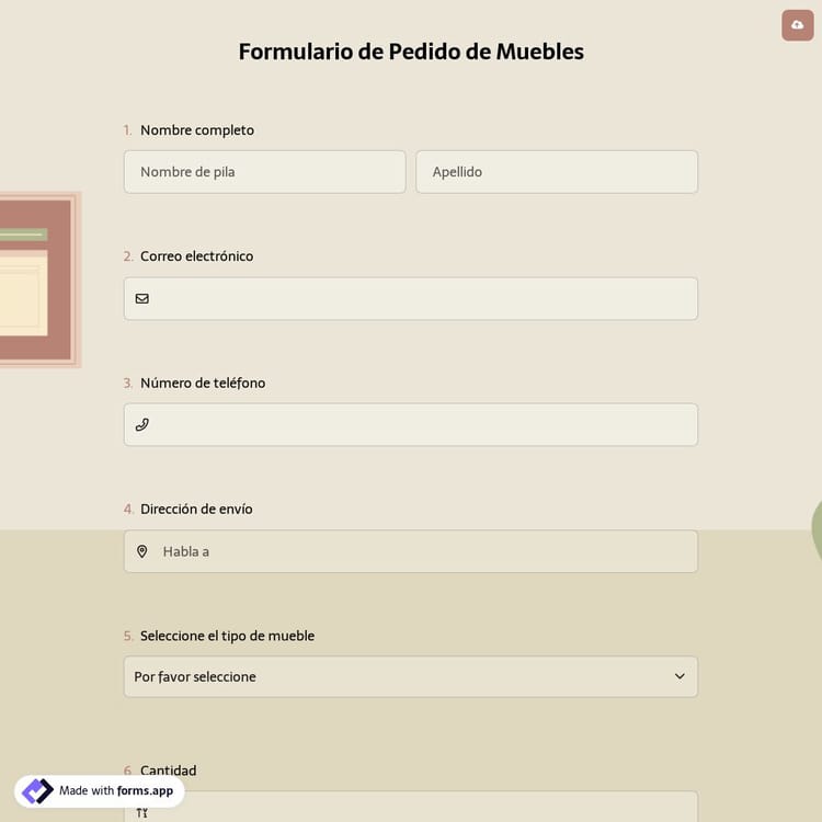 ¿Necesita un formulario de pedido de muebles para su negocio? Si es así, forms.app puede ayudarlo a crearlo de forma gratuita. Utilice el creador de formularios para crear un formulario de pedido que se adapte a sus necesidades, o comience desde cero y cree su propio formulario de pedido según sus necesidades.