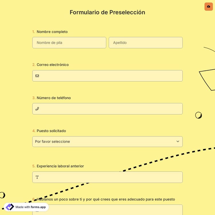 Un formulario de preselección es un tipo de formulario para participantes calificados. Se utiliza para seleccionar a los participantes que formarán el siguiente paso de un evento, examen o entrevista. Puede satisfacer esta necesidad con la plantilla gratuita proporcionada por forms.app. ¡Empiece a utilizar la plantilla de formulario de lista corta ahora!