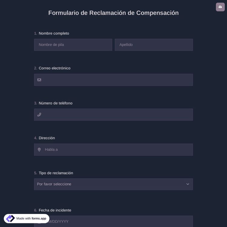 Un formulario de solicitud de compensacion es un formulario utilizado para obtener solicitudes de compensacion de seguros de personas que han sufrido perdidas medicas o materiales. Estos formularios generalmente solicitan informacion sobre los datos personales y de contacto del solicitante, detalles sobre el incidente o perdida, asi como documentos o pruebas de apoyo. Tambien incluyen preguntas sobre el monto de la compensacion solicitado por el solicitante.