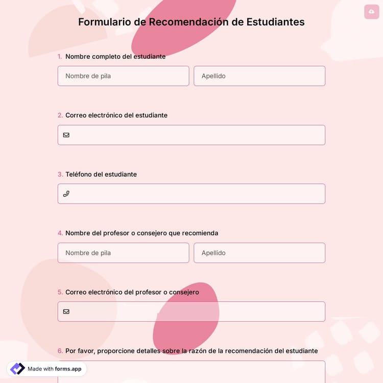 Los formularios de recomendación, como el formulario de recomendación de estudiante, permiten recopilar todos los datos esenciales de los estudiantes, como información básica, nombre de la escuela actual, promedio acumulado y número de contacto de los estudiantes. También pueden incluir campos que demuestren el éxito del estudiante. Para comenzar, haz clic en el botón "Usar modelo" a continuación.