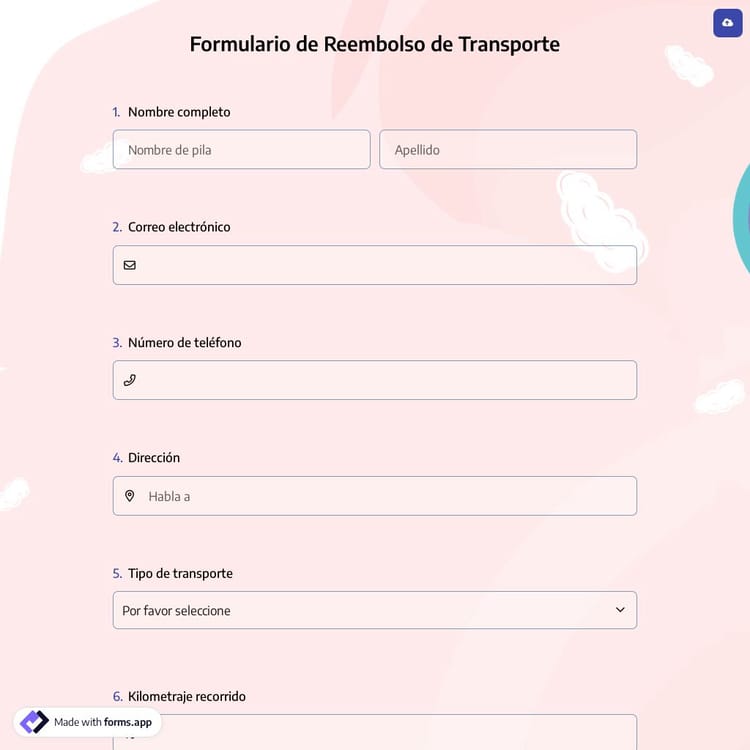 Administre su proceso de reembolso de transporte con forms.app y facilite la vida de sus clientes para aprovechar su servicio sin problemas. Haga clic en el botón a continuación para utilizar este modelo de formulario de reembolso de transporte gratuito.