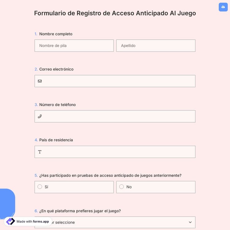 Los desarrolladores de juegos necesitan un formulario de registro de acceso temprano al juego para abrir sus juegos al acceso temprano y aceptar participantes. Con un sitio gratuito de creación de formularios en línea como forms.app, es fácil de hacer. Cree un formulario utilizando la plantilla de formulario de registro de acceso temprano al juego que aparece a continuación.