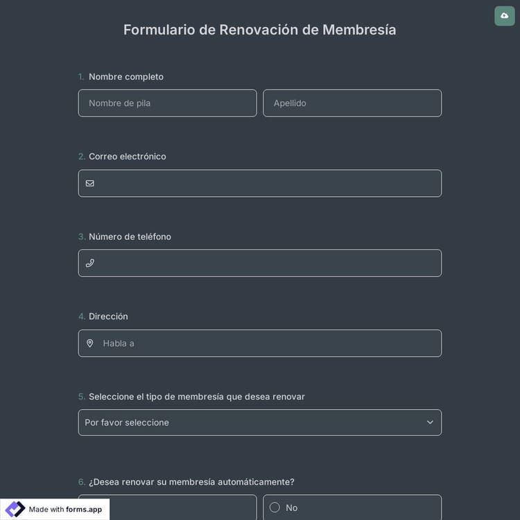 Los formularios de renovación de membresía son documentos utilizados para recopilar información de los miembros que desean renovar su membresía en un club u organización. Este formulario puede ser utilizado por organizaciones de todos los tamaños, desde pequeños grupos hasta grandes organizaciones nacionales o internacionales. Cree su formulario utilizando los modelos de formulario gratuitos de forms.app y facilite su proceso de renovación de membresía.