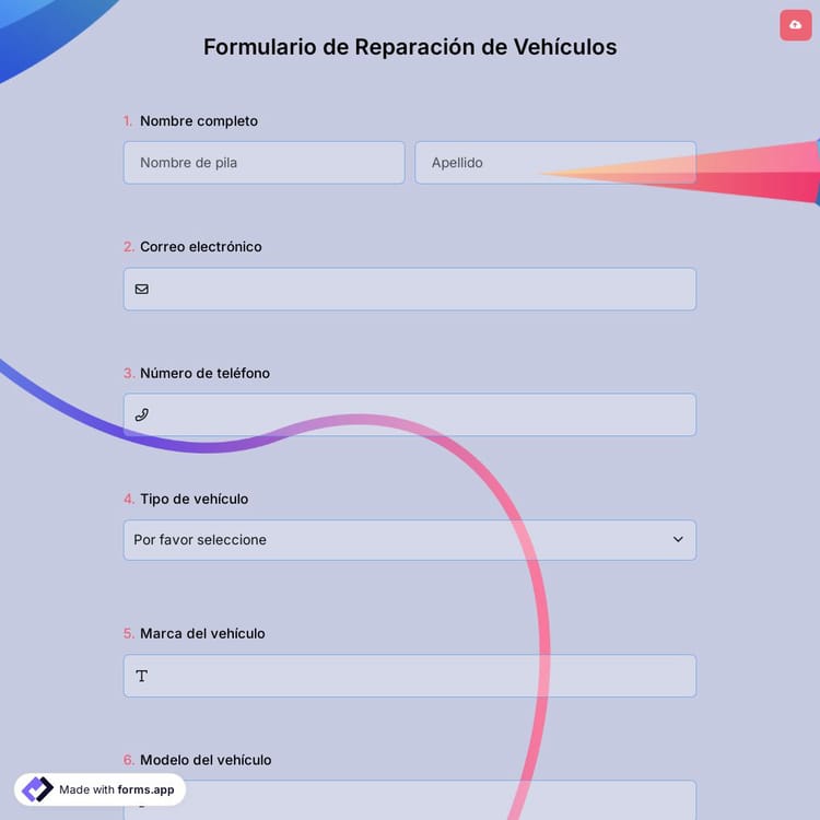 Si se dedica al negocio de reparación o servicio de automóviles, puede utilizar el formulario gratuito de reparación de vehículos en línea en forms.app. Puede insertarlo en su sitio web para gestionar los pedidos en línea de sus clientes. ¡Empiece hoy mismo con la plantilla de formulario de reparación de vehículos gratuita!