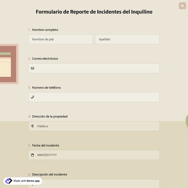 Con las funciones avanzadas de forms.app, será fácil obtener lo mejor del formulario de reporte de incidentes del inquilino. Puedes comenzar seleccionando una plantilla lista para crear un formulario. Luego, puedes cambiar el tema del formulario y agregar o eliminar preguntas. Finalmente, no olvides agregar el campo de carga de imagen y el campo de firma para los elementos dañados.