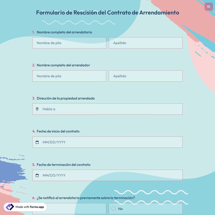 Una vez que los inquilinos firmen este acuerdo de rescisión, quedarán libres de cualquier obligación con la propiedad alquilada. El uso de un formulario de acuerdo en línea como alternativa a una carta de rescisión del contrato de arrendamiento lo ayudará a mantener todos los archivos en un solo lugar y obtener los datos necesarios mientras está sentado cómodamente en su silla. Así que pruébalo hoy y crea tu propio formulario de terminación del contrato de arrendamiento en forms.app.