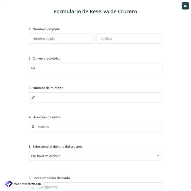 Las compañías de cruceros y agencias de viajes pueden utilizar esta plantilla de formulario de reserva de crucero gratuito para crear un formulario en menos de un minuto. Organizará la recopilación de información de los pasajeros. ¡Puedes comenzar a construir tu formulario de inmediato haciendo clic en el botón "usar plantilla" a continuación!