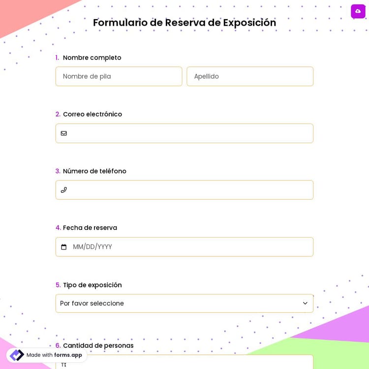 Puede resultar difícil recopilar la información necesaria al aceptar invitados a una exposición. Pero con un creador de formularios, como forms.app, puedes automatizar este proceso y hacerlo más fácil tanto para ti como para tus invitados. Con un formulario de reserva, las personas pueden ingresar fácilmente su información y reservar su lugar en su próxima exposición. Gracias a las funciones avanzadas de forms.app, puedes incluso cobrar pagos para el evento utilizando un campo de pago.