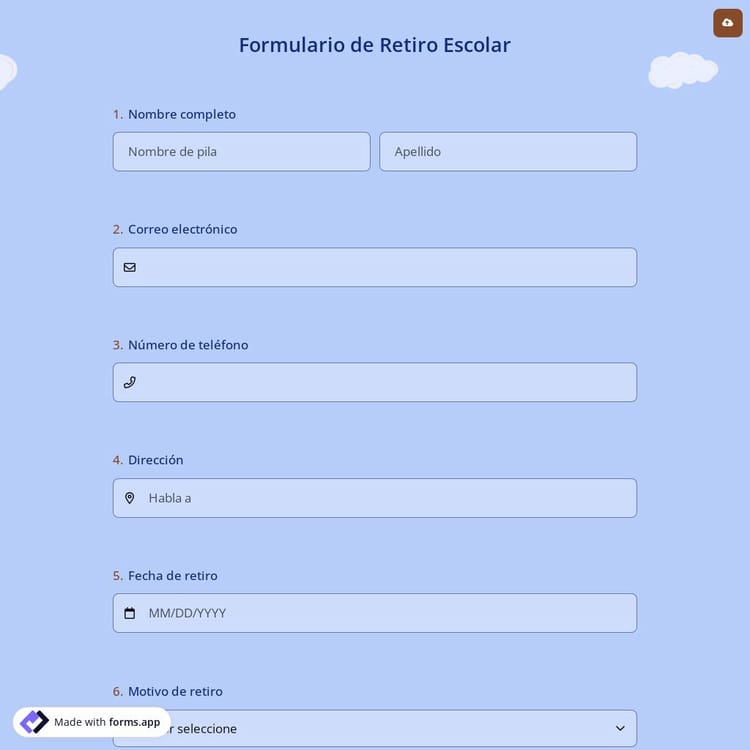 Cree el mejor formulario de retiro escolar para su institución educativa en forms.app con una experiencia fluida! Puede editar, diseñar y compartir fácilmente su formulario con la interfaz amigable de forms.app. Comience a crear su formulario utilizando el modelo de formulario de retiro escolar gratuito!