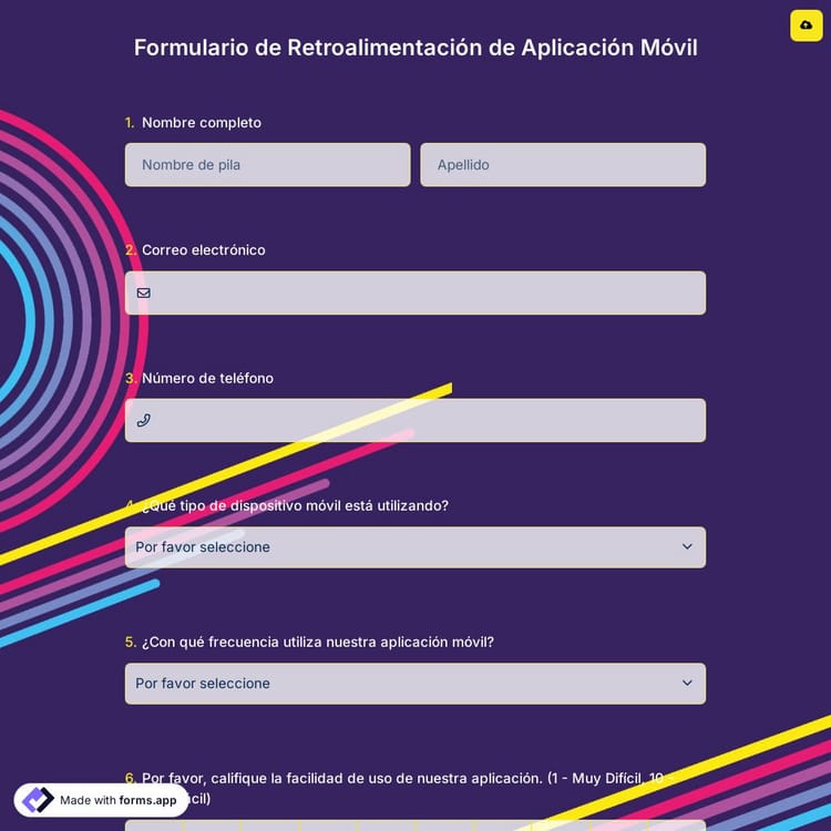 Las aplicaciones moviles ahora son parte de nuestras vidas. Desde el banco hasta los mensajes, desde las compras hasta las redes sociales, nos permiten hacer todo en una pantalla de unos pocos centimetros. Como millones de personas interactuan con aplicaciones moviles todos los dias, siempre necesitan mejoras. Utilice un formulario de retroalimentacion en linea para aplicacion movil para recopilar comentarios de los usuarios.