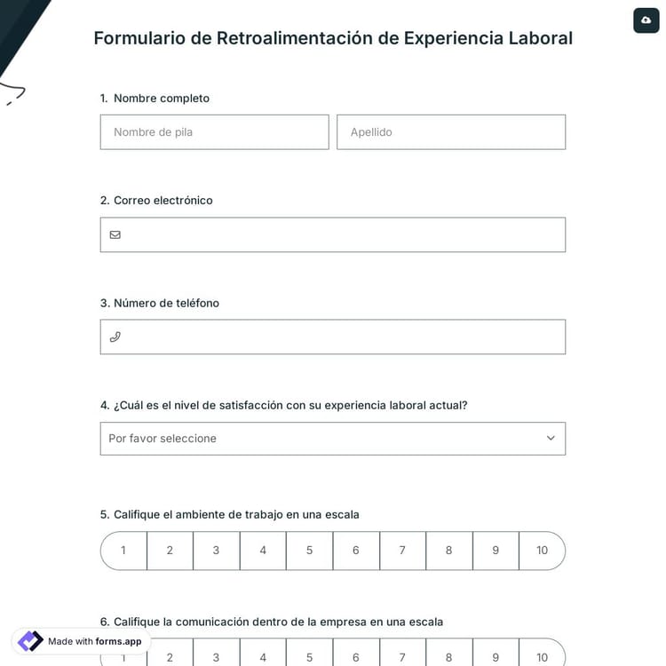 Los formularios de feedback sobre la experiencia de trabajo son documentos en línea que una empresa puede utilizar para evaluar el rendimiento o recopilar comentarios sobre la experiencia de trabajo de un empleado. Este formulario te ayudará a mantener organizada toda la información sobre el feedback de la experiencia de trabajo y a obtener comentarios futuros proporcionando una forma sencilla para que los empleados envíen toda la información sobre su experiencia de trabajo. Puedes obtener el formulario de feedback sobre la experiencia de trabajo en esta página y personalizarlo según tus necesidades.