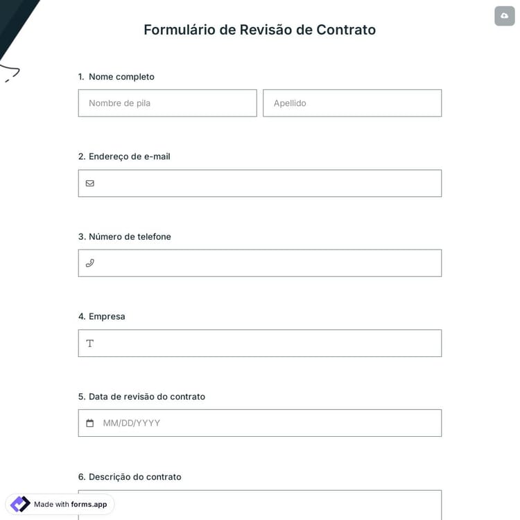 El examen de contrato puede ser una tarea muy pesada y compleja a veces. Para simplificar y acelerar su carga de trabajo, necesita un constructor de formularios gratuito como forms.app. Comience ahora usando esta plantilla de formulario de examen de contrato para crear su formulario.
