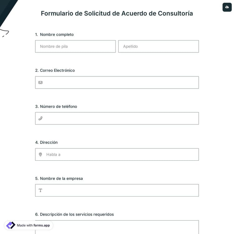 El formulario de solicitud de acuerdo de consulta es un documento que protege a ambas partes bajo la ley. Debes usar este formulario de consentimiento para explicar en detalle las expectativas entre las personas que brindan servicios de consulta o empresas que brindan servicios de consulta al cliente. Detalles como la duración de este servicio, el costo y lo que cubre también deben incluirse en el formulario.