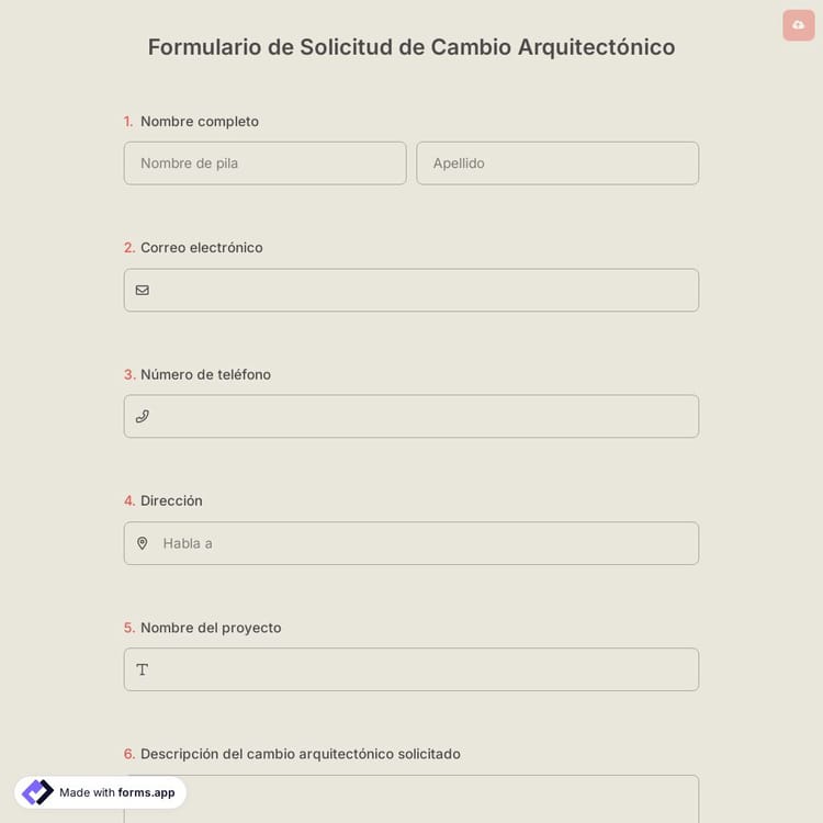 Si recibe solicitudes de ciudadanos que desean realizar un cambio arquitectónico en su propiedad residencial, utilice nuestro formulario de solicitud de cambio arquitectónico en línea y comience a recibir solicitudes de manera fácil y eficiente. Nuestros formularios son gratuitos y listos para usar; no necesita habilidades de codificación!