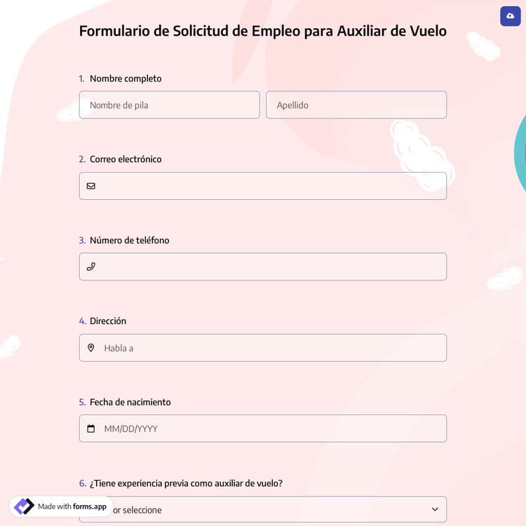 La creación de formularios en línea se ha vuelto mucho más profesional con forms.app. Facilita su vida ofreciendo plantillas listas con diseños gratuitos y personalizables. Veamos ahora cómo crear un formulario de solicitud de empleo para comisario de abordo.